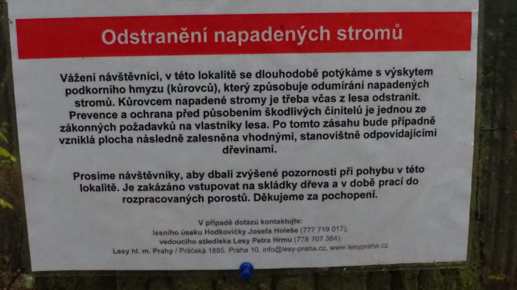 Oblast je ve správě hlavního města ale z hlediska životního prostředí má stav ekosystému Modřanské rokle největší dopad na obyvatele Prahy 12. Očekával bych, že zástupci obce budou nápravu vyžadovat. Zbývá doslova jen pár měsíců na nutná lesnická opatření, než nastane další kůrovcová sezóna. Od podzimu se zde ale téměř nic neděje. Na podzim roku 2019 byly sice lesníky po okrajích i uvnitř těchto porostů vyvěšeny dodnes přítomné informační cedulky „Odstranění napadených stromů“ a „Těžba kůrovcového dříví v Modřanské rokli“, tím však aktivita Lesů hlavního města Prahy skončila. Na vývěskách se přitom doslova píše: „Prevence a ochrana před působením škodlivých činitelů je jednou ze zákonných požadavků na vlastníky lesa.“ Jinde pak: „Smrky zde byly vysázeny před cca 100lety…nemají zde adekvátní podmínky k životu… Nejsou-li napadené stromy včas asanovány dochází k masivnímu rozšiřování těchto škůdců na okolní porosty… Vzniklé holiny zalesníme vhodnějšími dřevinami a borovicemi.“ Obsah vývěsek je však opakem toho, jak lesníci postupují, což mě přimělo k otázkám a úvahám o „nouzi“, ve které dnes lesy obecně jsou a co s tím lze alespoň místně udělat.